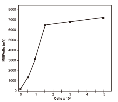 図2.細胞濃度が増加すると感度も増加するが、濃度が高すぎると細胞のセルフクエンチングにより感度は減少する。