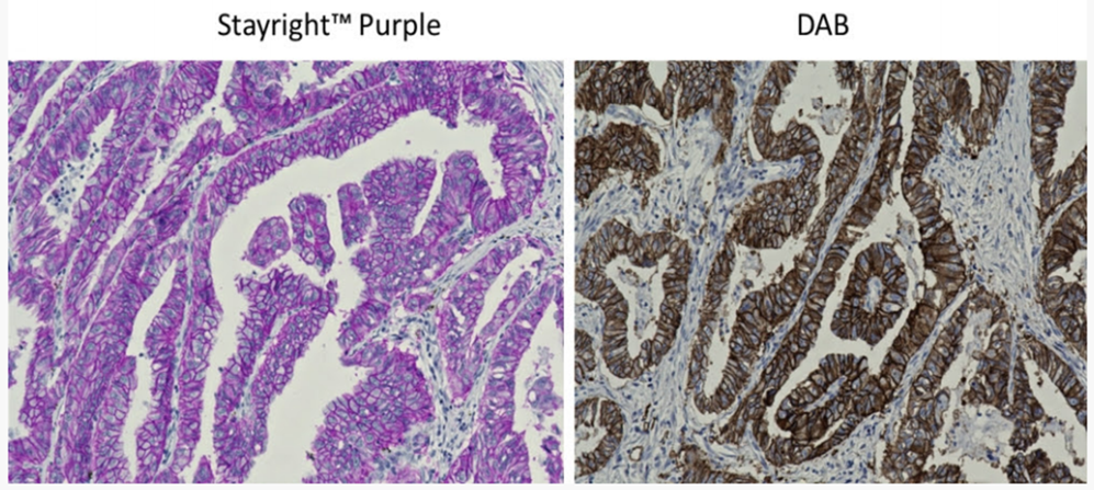 この問題に対処するため、AAT Bioquest社は、DABよりもはるかに安全なIHC用色素として、新しいStayright™ Purpleを開発しました。Stayright™ Purpleは、HRPの存在下で、DABと同様に高感度で、クリーンかつ濃紫色の染色を迅速かつ簡便に行うことができます。