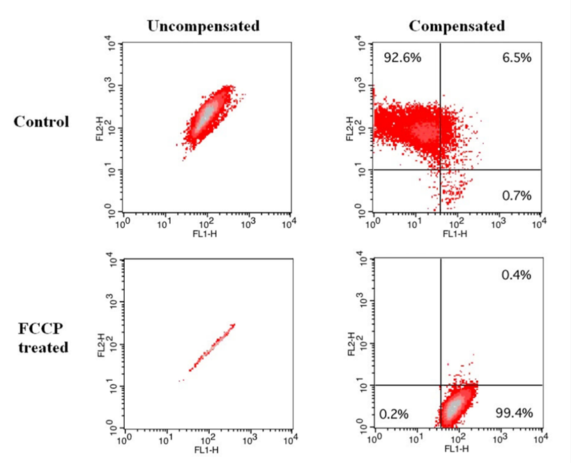 JC-1はフローサイトメトリーによるミトコンドリア膜電位の測定に広く使用されていますが、水溶性が低く、1µMの濃度でも、バッファーの中で沈殿する傾向があります。