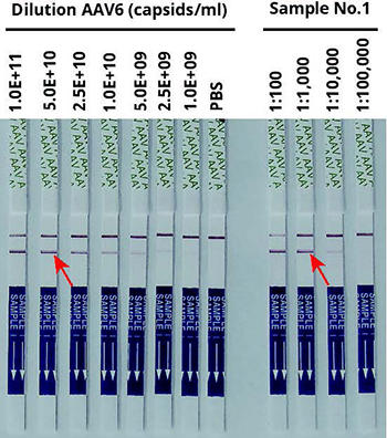 PROGEN Biotechnik 社AAV ELISA キットは、AAVの総カプシド力価を正確に測定することが可能な最も信頼性のある方法であり、業界標準品を目指して開発が進められました。しかし遺伝子治療研究の分野では、急成長による開発競争により、製品の市場投入までにかかる時間制約が厳しくなってきています。PROGEN Biotechnik社は本課題への取り組みとして、ELISA の原理に基づく半定量的なラテラルフローアッセイのDip'n'Check AAVを開発しました(図1)。Dip'n'Check AAVはAAVセロタイプ1、2、3、6、8、9に使用可能な製品であり、研究者が抱える時間制約の問題を解決します。
