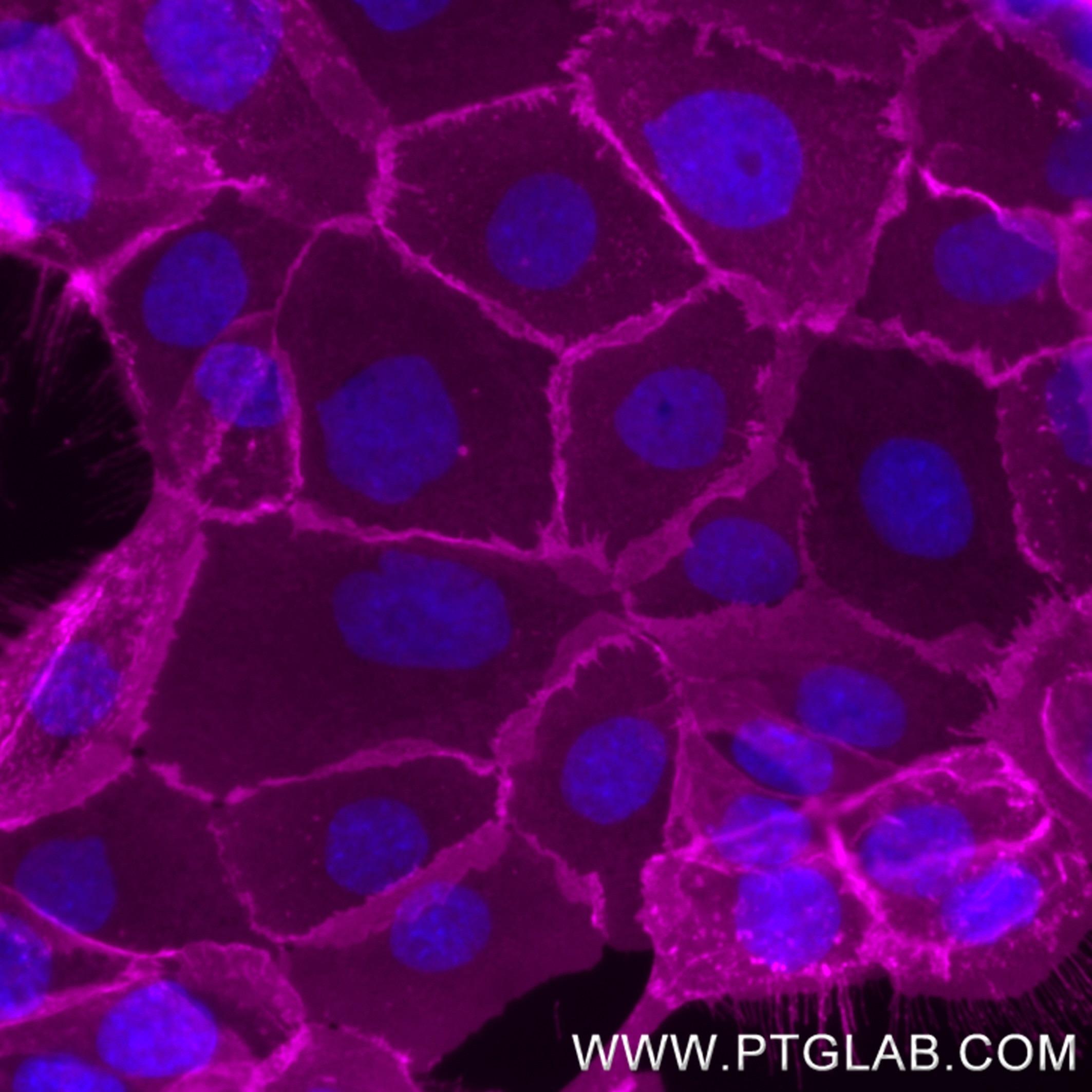 Live A431 cells were incubated with anti-human EGFR (Cetuximab biosimilar) followed by Nano-Secondary® alpaca anti-human IgG, recombinant VHH, CoraLite® Plus 647 [CTK0117] (magenta, shuGCL647-2 ). Cells were fixed and nuclei were stained with DAPI (blue). Epifluorescence images were acquired with a 40x objective and post-processed.