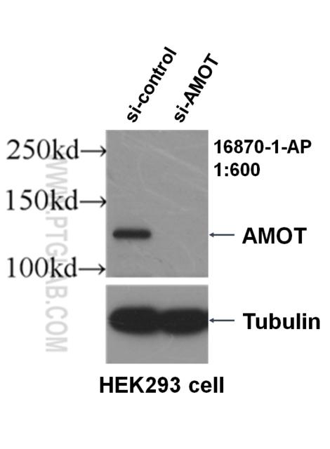 ]。最も豊富な発現は、胎盤および骨格筋で認められます。AMOTは、分子量130kDa(p130)と80kDa(p80)を示す2つのアイソフォームを有します。本抗体(品番:16870-1-AP)は、p130のみを認識します。