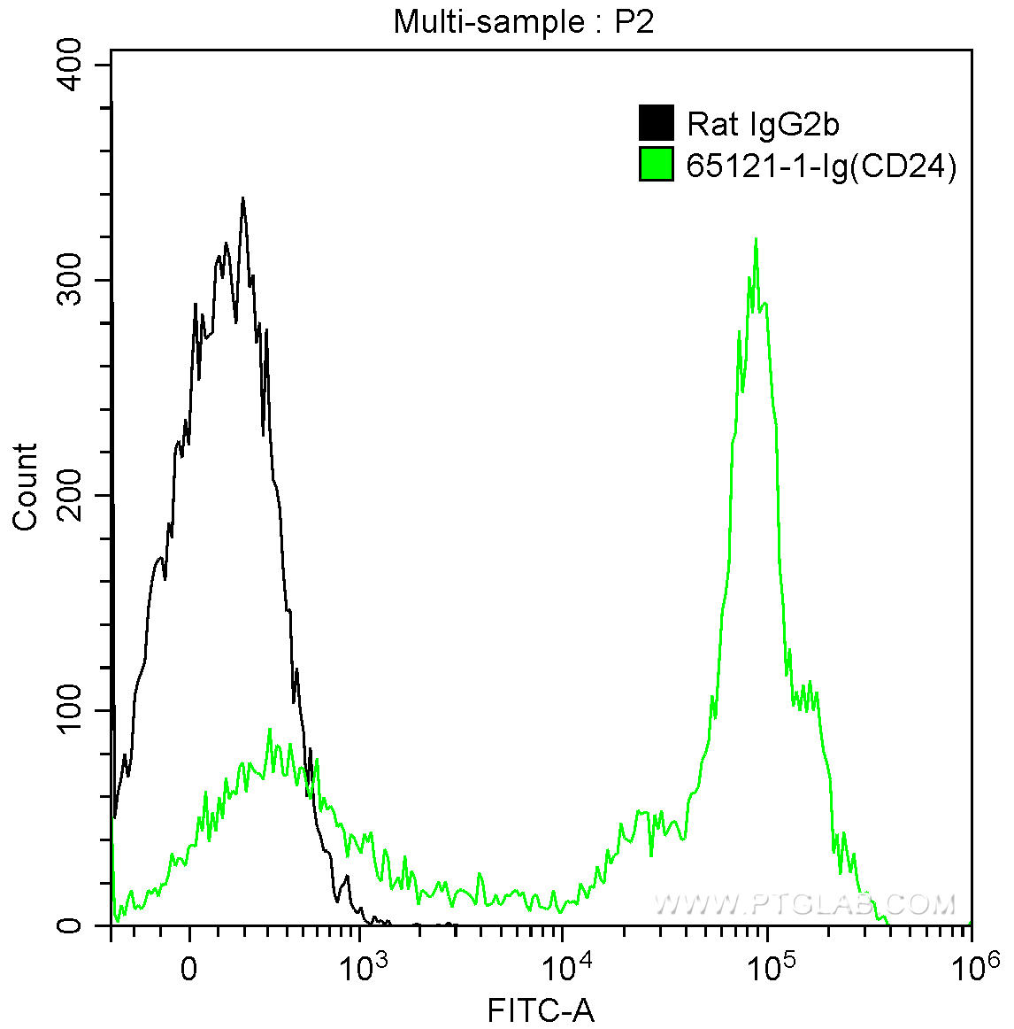 1X10^6 BALB/c mouse splenocytes were surface stained with 0.5 ug Anti-Mouse CD24 (65121-1-Ig, Clone: M1/69) and FITC anti-rat IgG2b Antibody at dilution 1:200 (green), or stained with 0.5 ug isotype control and FITC anti-rat IgG2b Antibody at dilution 1:200 (black). Samples were not fixed.