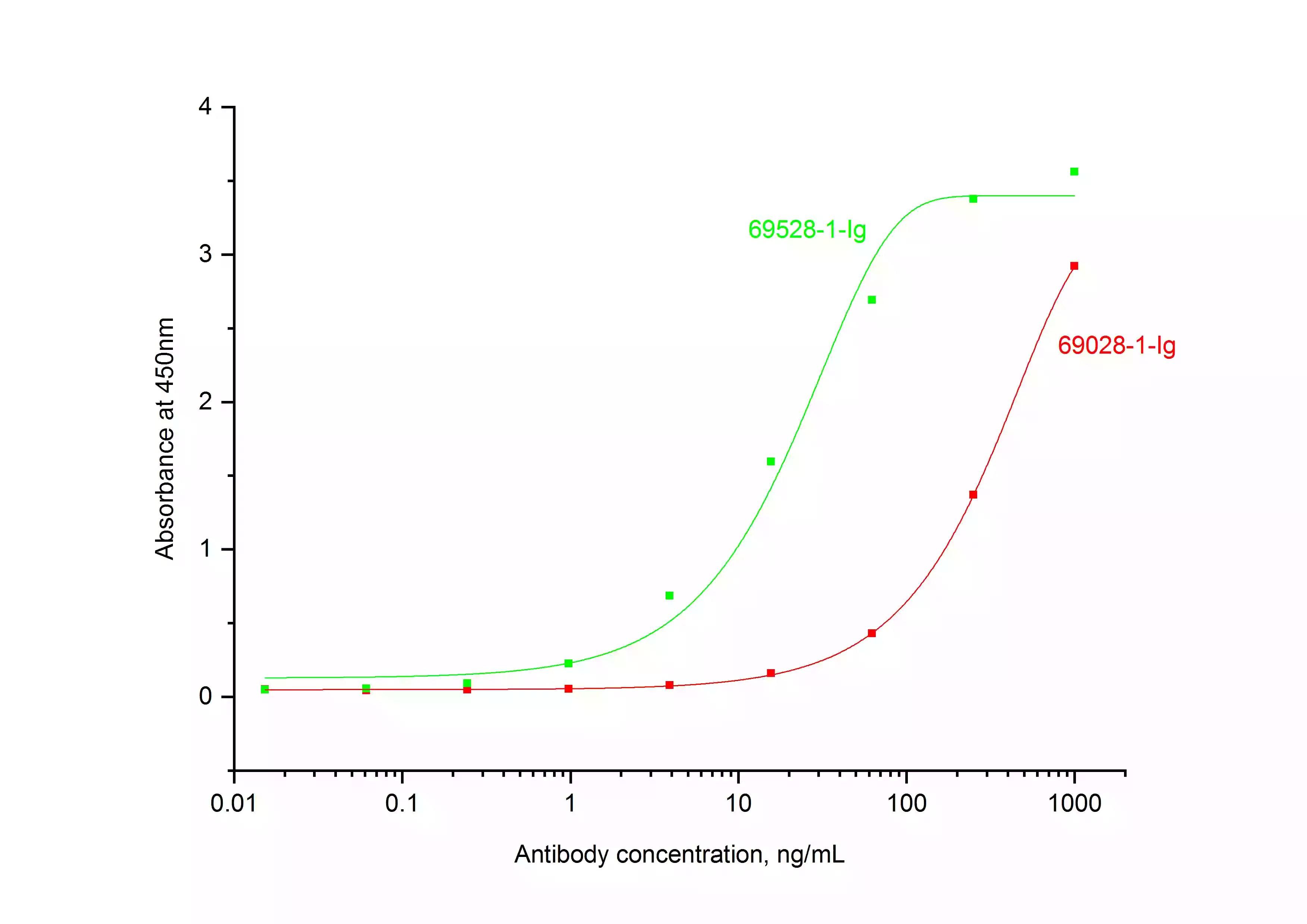 Indirect ELISA was carried out by coating recombinant Human Thrombopoietin (Cat.NO. HZ-1248) at 70 ng/well followed by blocking and adding serial diluted Thrombopoietin antibody 69028-1-Ig and 69528-1-Ig respectively. Signal was developed with TMB and stopped by H2SO4. Signal strength was measured by absorbance at 450 nm.