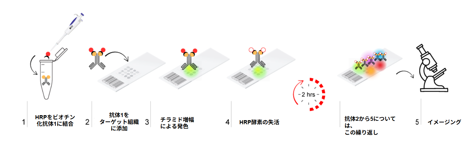 AtlasPlex™は、FFPE(ホルマリン固定パラフィン包埋)組織を対象とした、マルチプレックス免疫組織染色(mIHC)アッセイです。従来の免疫組織染色を拡張し、高解像度で反復可能なmIHC解析を高スループットで実現します。本アッセイは、1日に最大5種類のバイオマーカーを検出できるよう設計されています。TSA(Tyramide Signal Amplification)法を採用した検証済みのキットに、3種または5種のビオチン標識抗体とチラミド蛍光色素が含まれており、二次抗体や複雑な最適化工程は不要です。