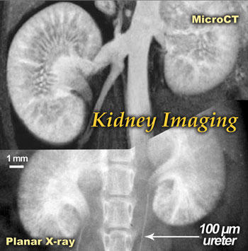 金ナノ粒子が血液からろ過(糸球体、細管を通り、尿管に入る)される事により、腎機能が可視化される。マンモグラフィユニットで撮影(8 mA.sec, 22 kVp)。