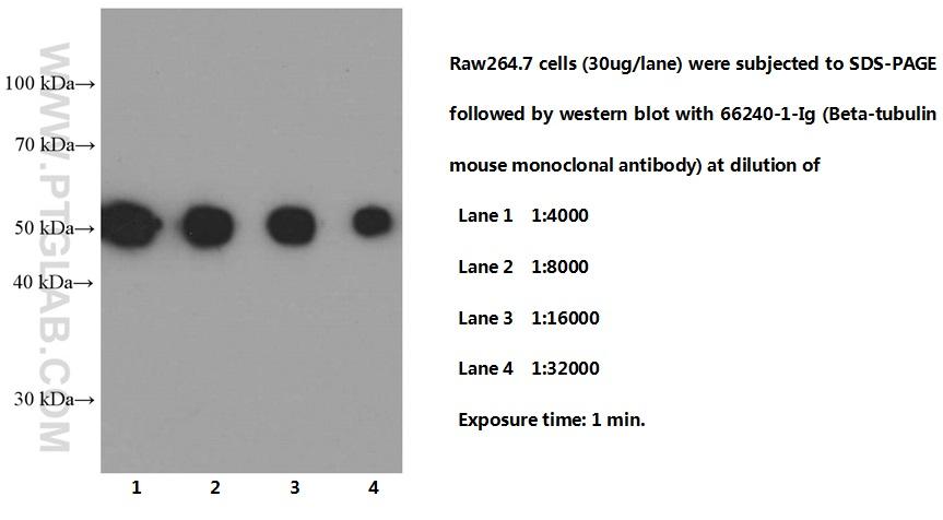 Beta Tubulin 抗体(anti beta Tubulin antibody)は、Beta Tubulin(βチューブリン)タンパク質を検出するマウスモノクローナル抗体およびポリクローナル抗体です。ウェスタンブロットのローディングコントロールとしても有用です。