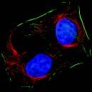 図3 CF633 Mix-n-Stainキットで標識した抗チューブリン抗体(赤)でHela細胞を染色した。アクチンフィラメントはCF488Aファロイジン(緑)で、核はDAPI(青)で染色した。画像はZeiss 510 Meta共焦点顕微鏡で撮影した。
