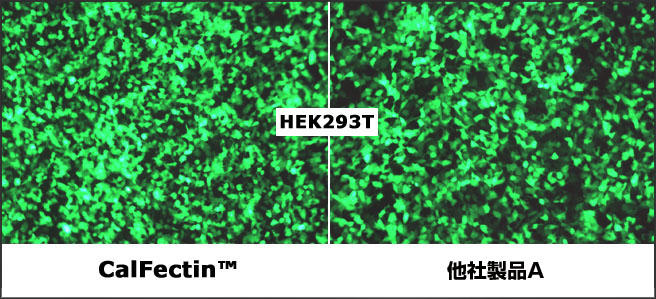HEK293T細胞をGFPタグ付DNA(全長14kb)をCalFectin™(左)と他社製品(右)を用いてそれぞれ導入した。これらの細胞は、トランスフェクション24時間後にNikon Eclipse蛍光顕微鏡で観察した。
