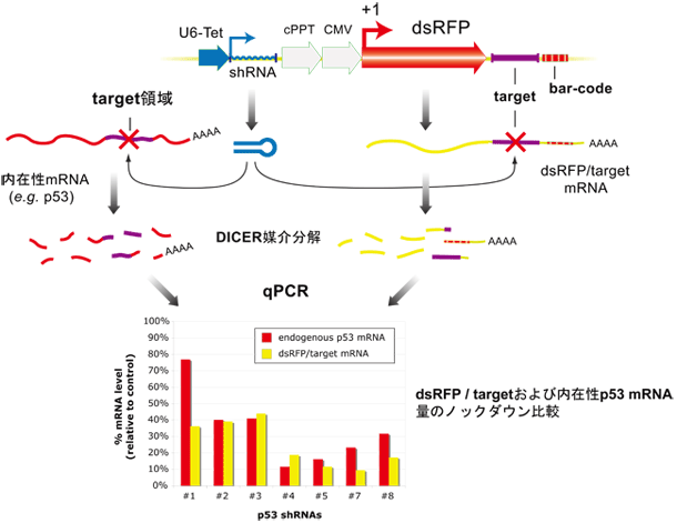 ゲノムDNA 上に統合されたshRNA-target レンチウイルスレポーターコンストラクトの略図およびRFP-target レポーターのノックダウン機構。