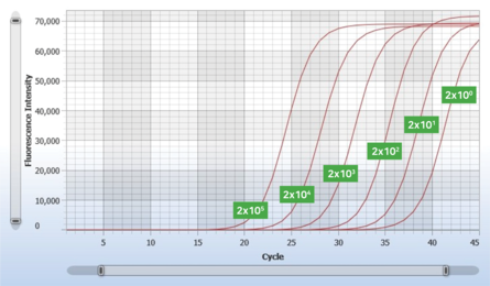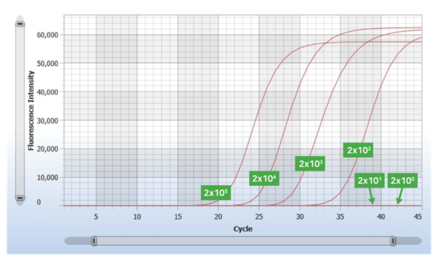 入力サンプルとしてHeLa細胞(2 × 105 〜 2 × 100 cells)を使用し、HPRT1 遺伝子の増幅は2ステップRT-qPCRで実施した。