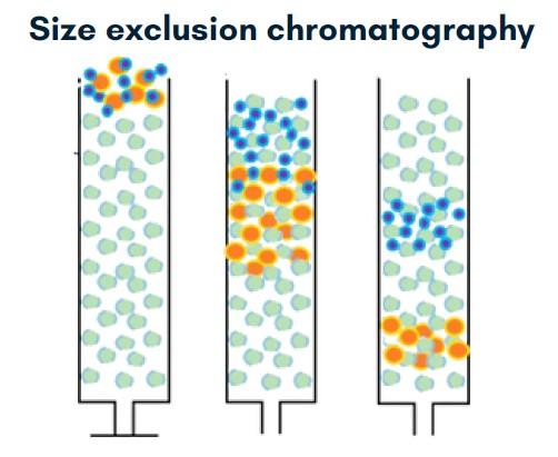 SECとは、溶液中の粒子を大きさに基づいて分離する方法です。カラムには安定した多孔性ゲル粒子が充填されています。EVsを含む溶液をSECカラムに加えると、小さな粒子は細孔に捕捉されますが、大きな分子は細孔に入らず、最初にカラムから溶出します。まず大きなEV粒子から始まり、小さなタンパク質や脂質粒子がそれに続くため、溶出フラクションの段階ごとに異なるサイズの分子が含まれることになります。