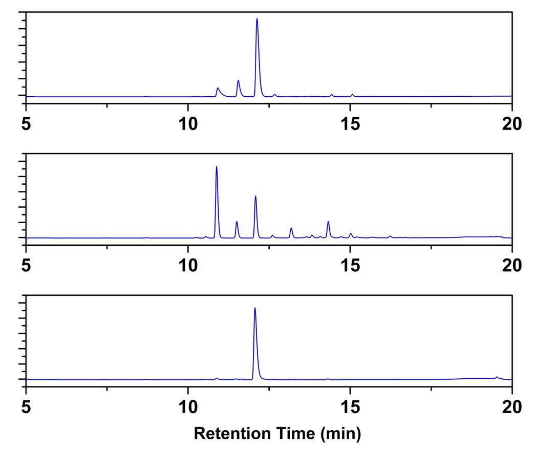 6-JOE SE については、他のフルオレセインスクシンイミジルエステルと比較してはるかに低い収率を示し、得られたコンジュゲートも精製がより困難になります。 近年、多くの 6-JOE SE の市販品を入手して分析したところ、すべての市販品が、図3 に示すように、6-JOE SE とアミノ修飾オリゴヌクレオチドの結合を複雑にする不純物を含むことがわかりました。市販の 6-JOE SE に関連する不純物には、非反応性の遊離 6-JOE 酸、3,6-JOE ジスクシンイミジルエステル および 3-JOE スクシンイミジルエステルが含まれます。特に、3-JOE スクシンイミジルエステルから得られたコンジュゲートは、所望の 6-JOE コンジュゲートから分離することが困難です。AAT Bioquest社が提供する 6-JOE SEには、図4 に示すように、3,6-JOE ジスクシンイミジルエステル や 3-JOE スクシンイミジルエステルは基本的に含まれていません。