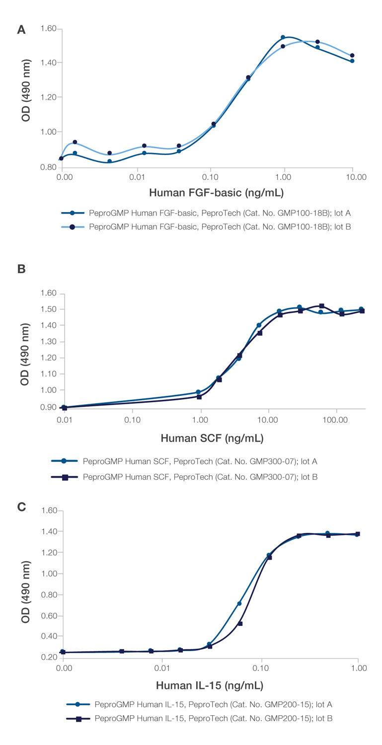 図2. PeproTechサイトカインのGMP、AOFおよびRUOグレードにおける生物活性の一貫性