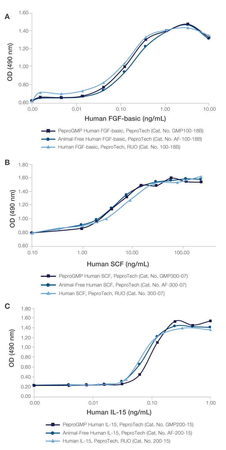 (A) human FGF-basicとマウス3T3細胞、(B) human SCFとTF-1細胞、(C) human IL-15とマウスCTLL-2細胞を用いて、細胞増殖アッセイを実施した。