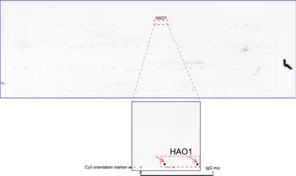 ![]() 図.3 ORG 社のoverexpression protein microarray chip をUltraMAB anti-HAO1 マウスモノクローナル抗体を用いて免疫染色(UM500082)。陽性反応を示すタンパク質は拡大したサブアレイ内に赤色矢印を用いてハイライトした。サブアレイ内に存在する全てのポジティブコントロールも明確にするためラベルした。 |