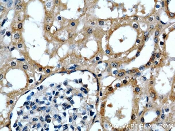APOL1抗体(品番:11486-2-AP、希釈倍率 1:50)を用いた、ヒト腎臓(パラフィン包埋切片)の免疫組織化学染色(40X)。