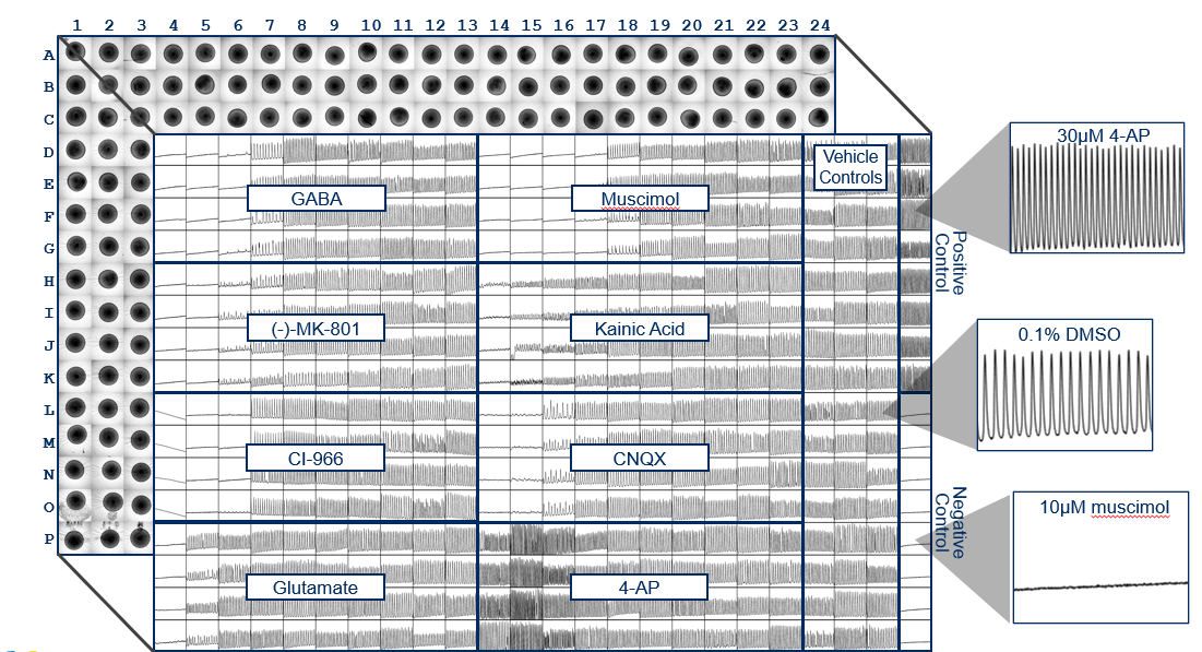 (左)1枚の384 well plateを用いて、8種のニューロモジュレーターに対するmicroBrain™ 3Dの応答性を測定した。