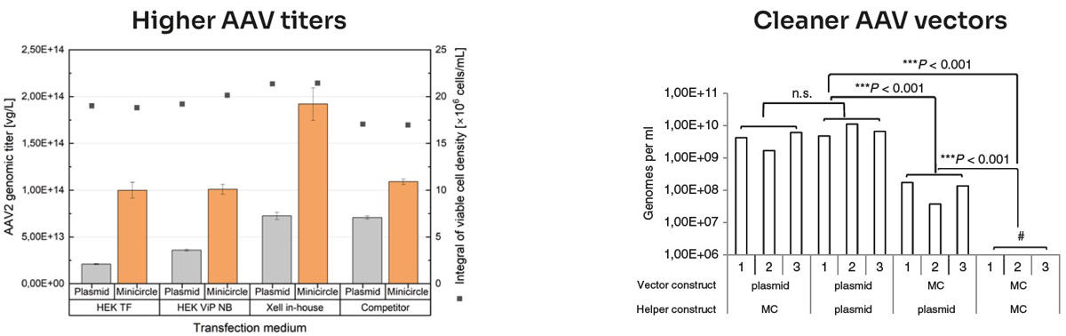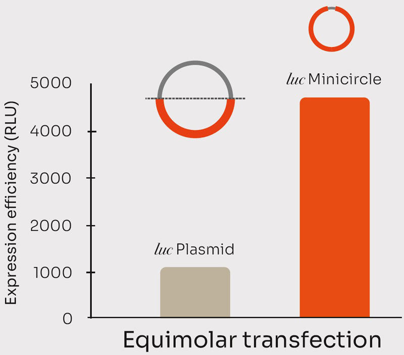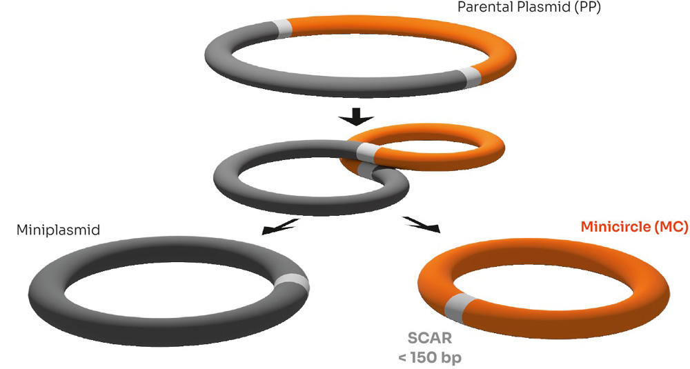 PlasmidFactory独自の作製技術によりE. coli 内での組換え反応を厳密に制御し、目的配列を保持する Minicircle(MC)とバックボーンのみからなる Miniplasmidを分離します。結果として、極めて均一なモノマー型スーパーコイル(cccDNA)の Minicircle を高純度で提供可能です。基礎研究、前臨床試験、毒性試験など幅広い用途に対応した、高効率DNAを提供します。