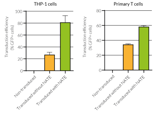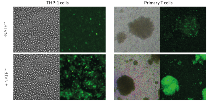 THP-1細胞(左)またはヒト初代T細胞(右)に、それぞれMOI 5およびMOI 1のGFPをコードするレンチウイルスベクターを用いて遺伝子導入を行った。NATE™ 非存在下、及び存在下で実施した。48時間後、GFP発現を蛍光顕微鏡 (上図)、フローサイトメトリー(下図)により解析した。