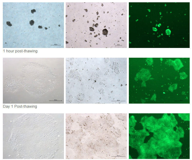 hESCをNutriFreez® D10 Cryopreservation Mediumで凍結後、マトリゲル上でNutriStem® hPSC XFに入れて解凍した。細胞は優れた接着能と増殖能力を保持している。