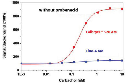 CHO-M1細胞を96ウェル黒壁/透明底コースタープレートの各ウェルに40,000細胞/100 µL/ウェルずつ播種して一晩培養した。プロベネシドを添加しない100 µL Fluo-4 AM またはCalbryte™ 520 AM を細胞に添加し、37℃で45分間培養した。表記した最終濃度となるようカルバコール(50 µL/ウェル)をFlexStation 3 を使って添加した。