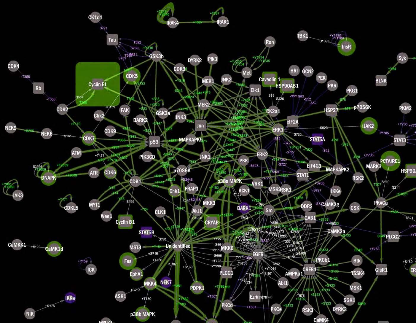 Figure 5. KiNetscape quantitative representation of the key EGF-induced changes in protein expression or phosphorylation from a Kinex™ KAM-900P antibody microarray analyses of the lysates from serum-starved A431 cells that were treated without or with 100 ng/ml EGF for 5 minutes.