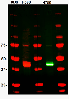 図2.ウサギ抗アクチン抗体を ProteinA-H680 および ProteinA-750 標識体で検出した。