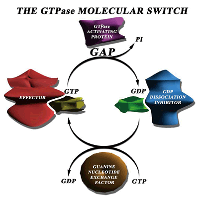 低分子量 GTPaseの Ras スーパーファミリー(例: Ras、Rho、Rab、Arf、Ran タンパク質)は、GDP結合型の「不活性化状態」と、GTP結合型の「活性化状態」とを循環するスイッチとして機能します。細胞内では、主に2種類の調節タンパク質によって、この2つの状態の循環が制御されています。活性化に関与するグアニンヌクレオチド交換因子(GEF: Guanine nucleotide Exchange Factor)と、不活性化に関与する GTPase 活性化タンパク質(GAP: GTPase Activating Protein)です。