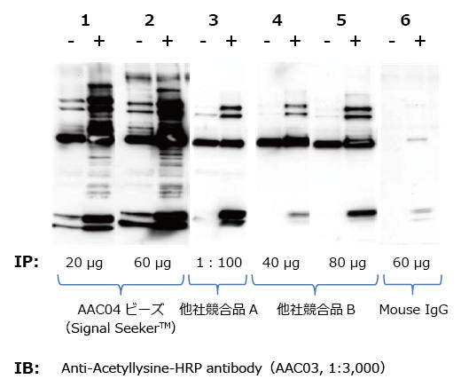 IPは、以下の条件で行っている。(1)AAC04を16.7 µL(20 µg抗体量)、(2)AAC04を50 µL(60 µg抗体量)、(3)他社競合品A: ラビット抗アセチル化リジンモノクローナル抗体ミックス(1/100希釈)、(4)他社競合品B: アセチル化リジンビーズ(40 µg抗体量)、(5)他社競合品B: アセチル化リジンビーズ(80 µg抗体量)、(6)マウスIgGコントロールビーズ(60 µg抗体量)