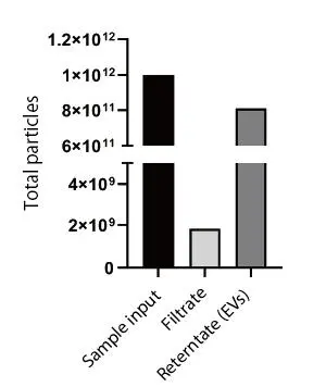 1×1012 の精製EVs(HBMPEU-100)を 1×PBS 20 ml で希釈し TFF-EVs にセットした。 EVsを含む回収液を 1×PBS 5 ml で回収し、ろ液および回収液の粒子含有量を NTA(ZetaView, Particle Metrix)で分析した。