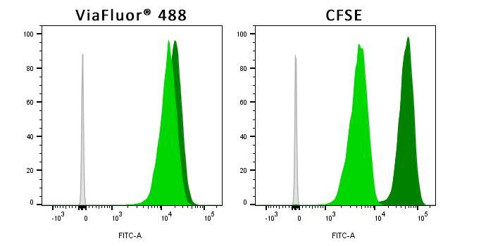 ViaFluor® 488 SEは、CFSEの改良版として開発された緑色の細胞増殖用色素です。ViaFluor® 488は、細胞毒性の低減をはじめとし、CFSEと比較して多くの利点があります。5 µMで使用した場合、CFSEは細胞に極めて有害ですが、ViaFluor® 488は同じ実験条件においてはるかに毒性が低いです(図5)。1 µMでは、ViaFluor® 488の毒性はまったく確認されていません。