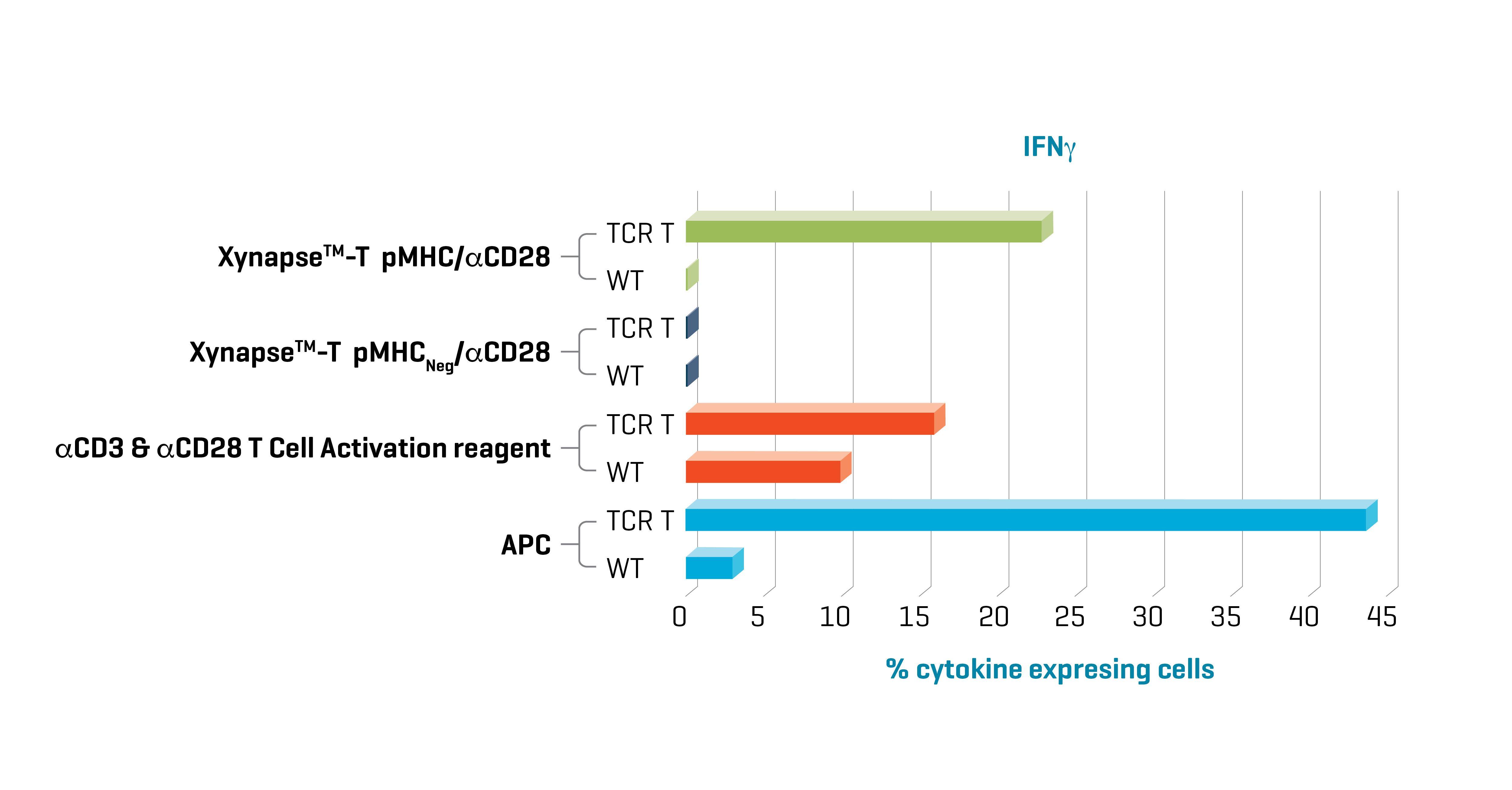 TCR導入T細胞と、その親株の野生型T細胞をXynapse™-T 試薬、ペプチドパルスしたAPC、aCD3およびaCD28抗体ベースの一般的なT細胞活性化試薬の3通りの方法で刺激した。