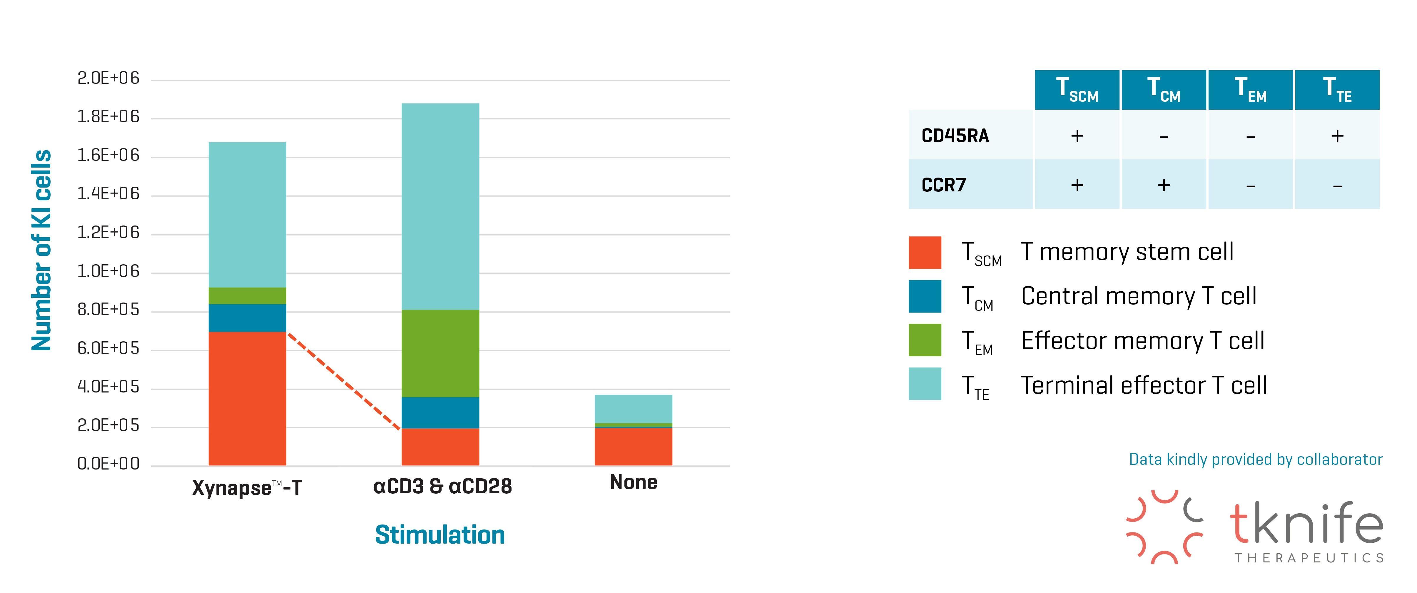 本実験では、TCR 導入T 細胞に対してXynapse™-T 試薬とaCD3およびaCD28抗体ベースの一般的なT細胞活性化試薬をそれぞれ用いて刺激を行った場合のフェノタイプ構成を比較した。一般的な T 細胞活性化試薬によって活性化された TCR 導入T 細胞の表現型構成と比べると、Xynapse™-T によって活性化された集団ではTSCMの割合が大幅に高いことが示された。