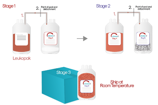 - Leukopakを準備する。接続チューブはバッグの近くで閉じてクリップで留め、使用済みのポートもすべて閉じる。