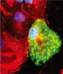 図2 細胞を、パラホルムアルデヒド(PFA)のみ(左)、または、パラホルムアルデヒドの後にメタノール(右)で固定し、糖鎖抗原(赤)および細胞骨格タンパク質(ミオシン、緑)に対して染色を行いました。右図は、より「正確」にミオシンが染色されていますが、メタノールによる透過処理により、左図に示された細胞表面の糖鎖の染色が観察されません(右)。細胞内の緑色の染色(左)は、PFA固定により形成された多くの小孔を通して、抗体が細胞内部に部分的に浸透した(明るい点)ことを示します。非透過性細胞(左)ではほとんど抗体が浸透できませんが、同じ種類の細胞で2回目の透過処理を行うと(右)、抗体が細胞内に浸透して細胞骨格全体を検出することができます。細胞の漏出が、ホルムアルデヒド処理の前から起こっていたのか、固定による影響なのかは不明です。しかし、右の画像がなければ、抗原がわずか数個の細胞にのみ含まれており、点状に染色されるという、誤った結論に導かれてしまいます。